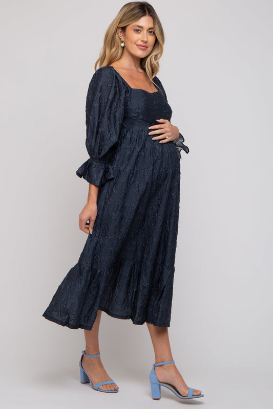 Navy Blue Metallic Jacquard Floral Maternity Midi Dress