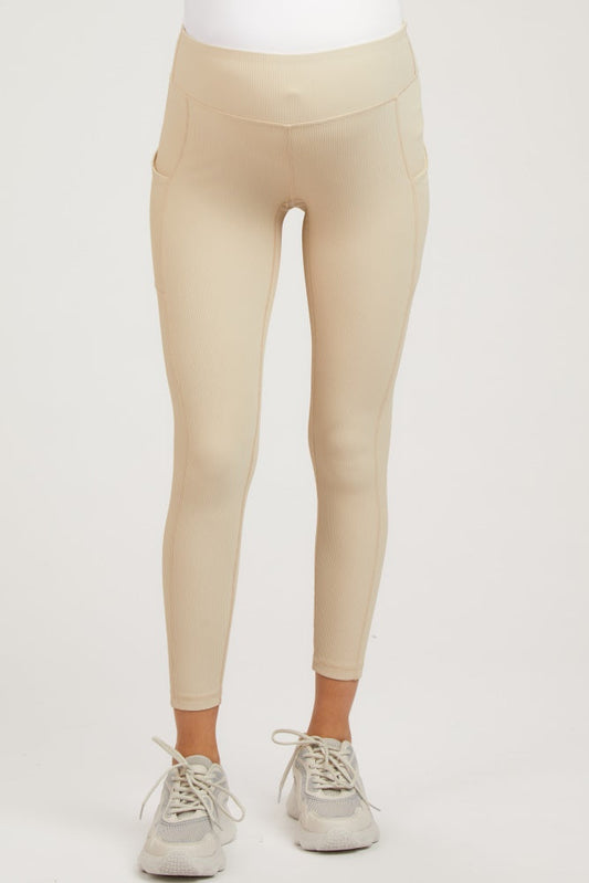 Beige Ribbed Crisscross Maternity Biker Shorts