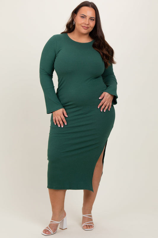 Forest Green Ribbed Side Slit Plus Maxi Dress