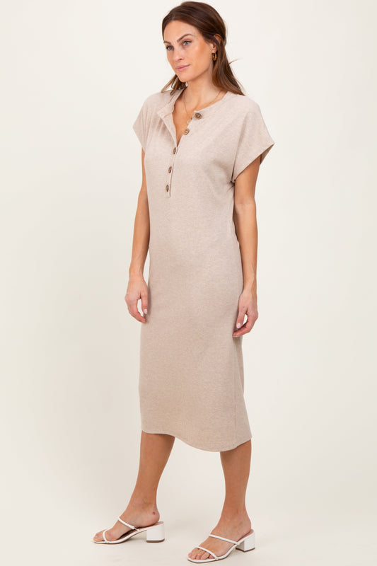 Beige Solid Ribbed Short Sleeve Button Down Knit Midi Dress