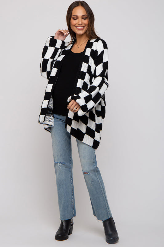 Black Checkered Rib Bubble Sleeve Button Maternity Cardigan