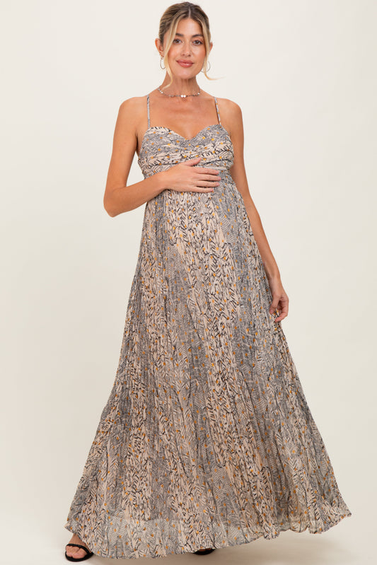 Beige Floral Pleated Chiffon Maternity Plus Midi Dress
