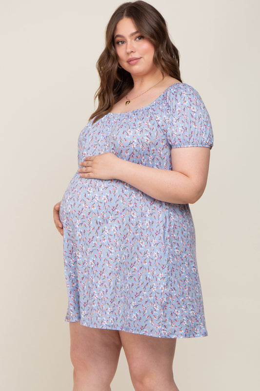 Blue Floral Ruffle V-Neck Maternity Midi Dress
