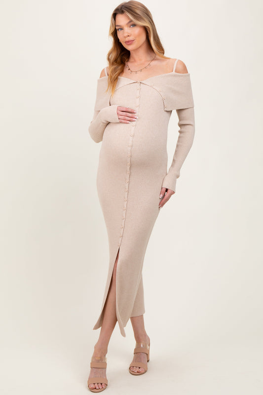 Beige Off Shoulder Long Cardigan Maternity Maxi Dress