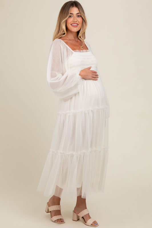 Cream Mesh Tiered Long Sleeve Maternity Maxi Dress