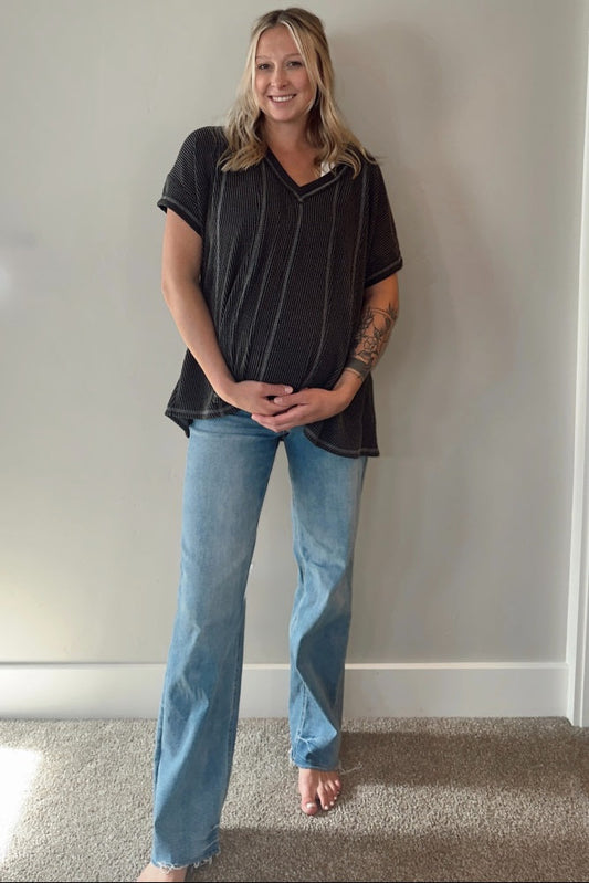 Charcoal Striped Ribbed V-Neck Oversized Short Sleeve Top