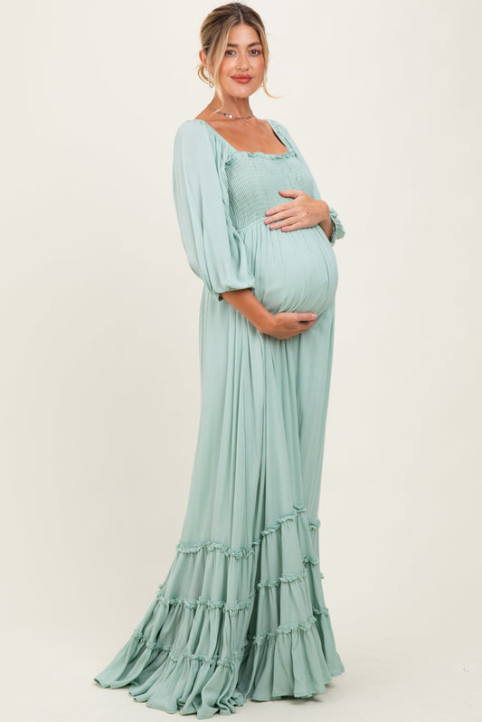 Sage Solid 3/4 Sleeve Smocked Top Tiered Maternity Maxi Dress