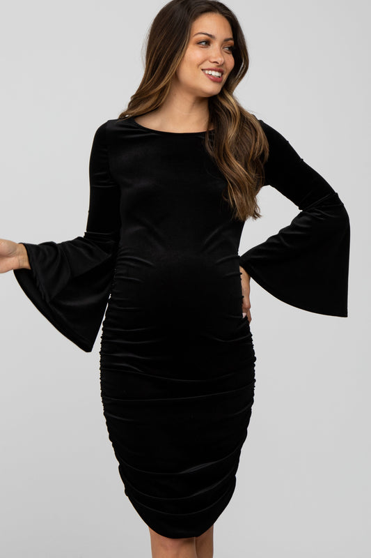 Black Velvet Ruched Bell Sleeve Maternity Dress