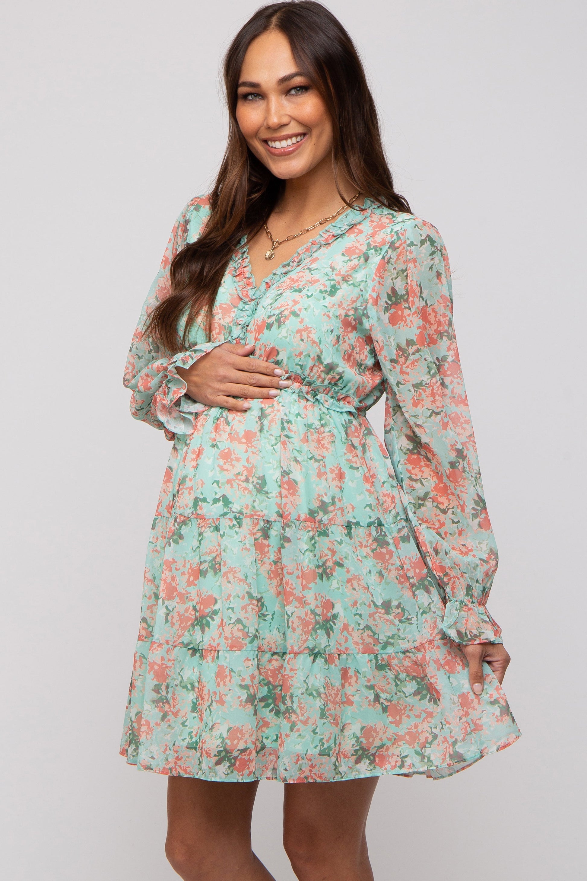 A floral maternity dress with a ruffle trimmed v-neckline, long semi sheer cinched sleeves, a ruffle accent elastic waist, and a gathered bottom tier.