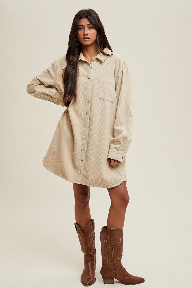 Meet your new favorite bump-friendly style! This Beige Corduroy Shirt Mini Dress is an effortlessly chic staple for every mom-to-be. Crafted in soft, lightweight corduroy, it features a classic collared neckline, full-length button front, and cuffed long sleeves for versatile styling. With a relaxed fit and mini length, this dress offers flattering comfort through every trimester and beyond. Pair it with sneakers or boots for an easy, on-trend look that transitions perfectly from errands to brunch. Nursing-friendly and timeless—this is the dress you’ll reach for again and again!
