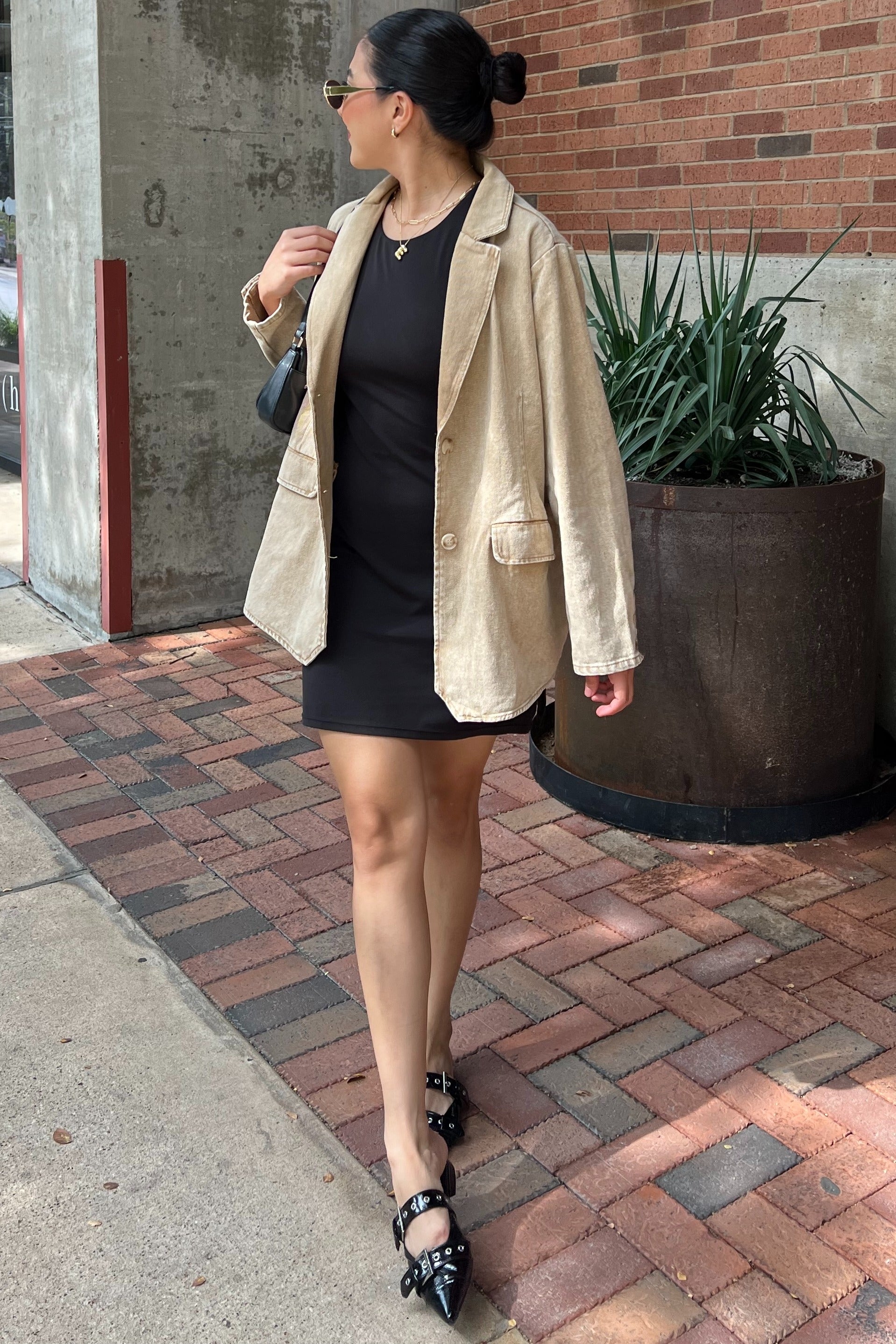 A denim maternity blazer featuring a notched lapel, two front pockets, front button closure, and long sleeves with buttons.