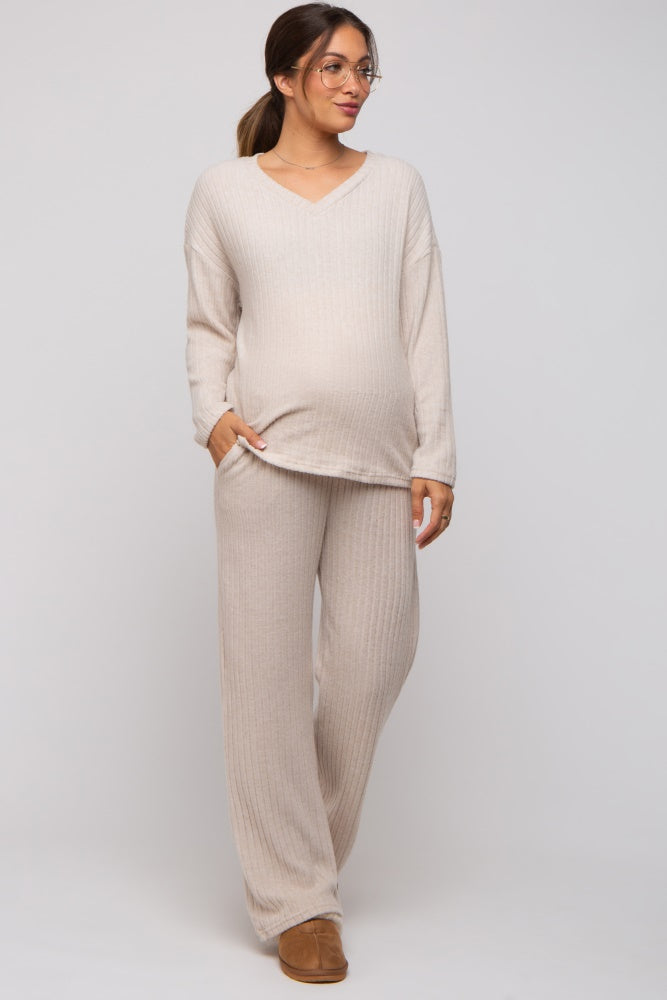 Beige Ribbed Soft Knit Long Sleeve Maternity Pajama Set