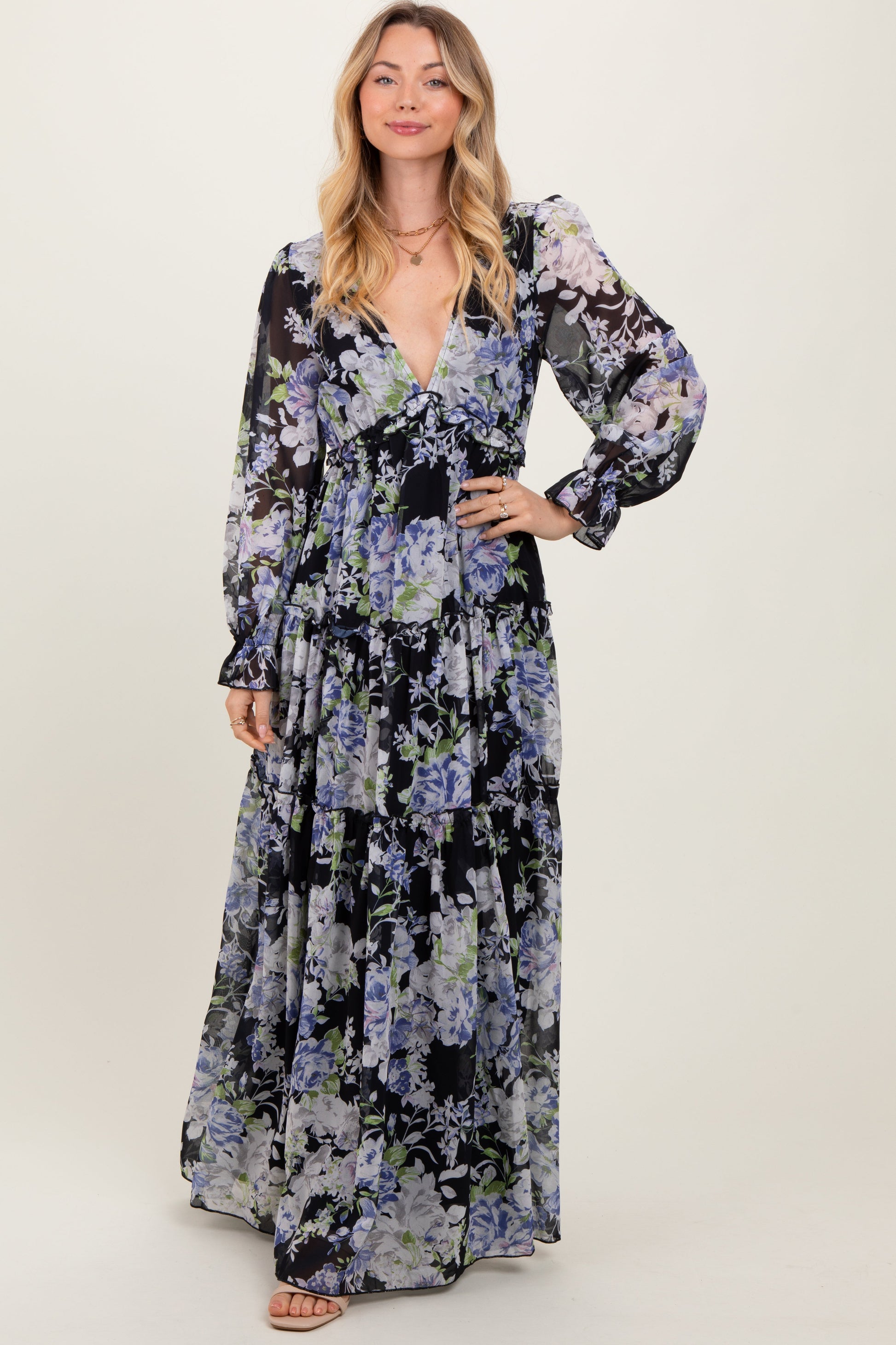 A floral chiffon maxi dress featuring a deep v-neckline, long sleeves with ruffle trim, an empire waist and a ruffle tiered skirt and double lining.