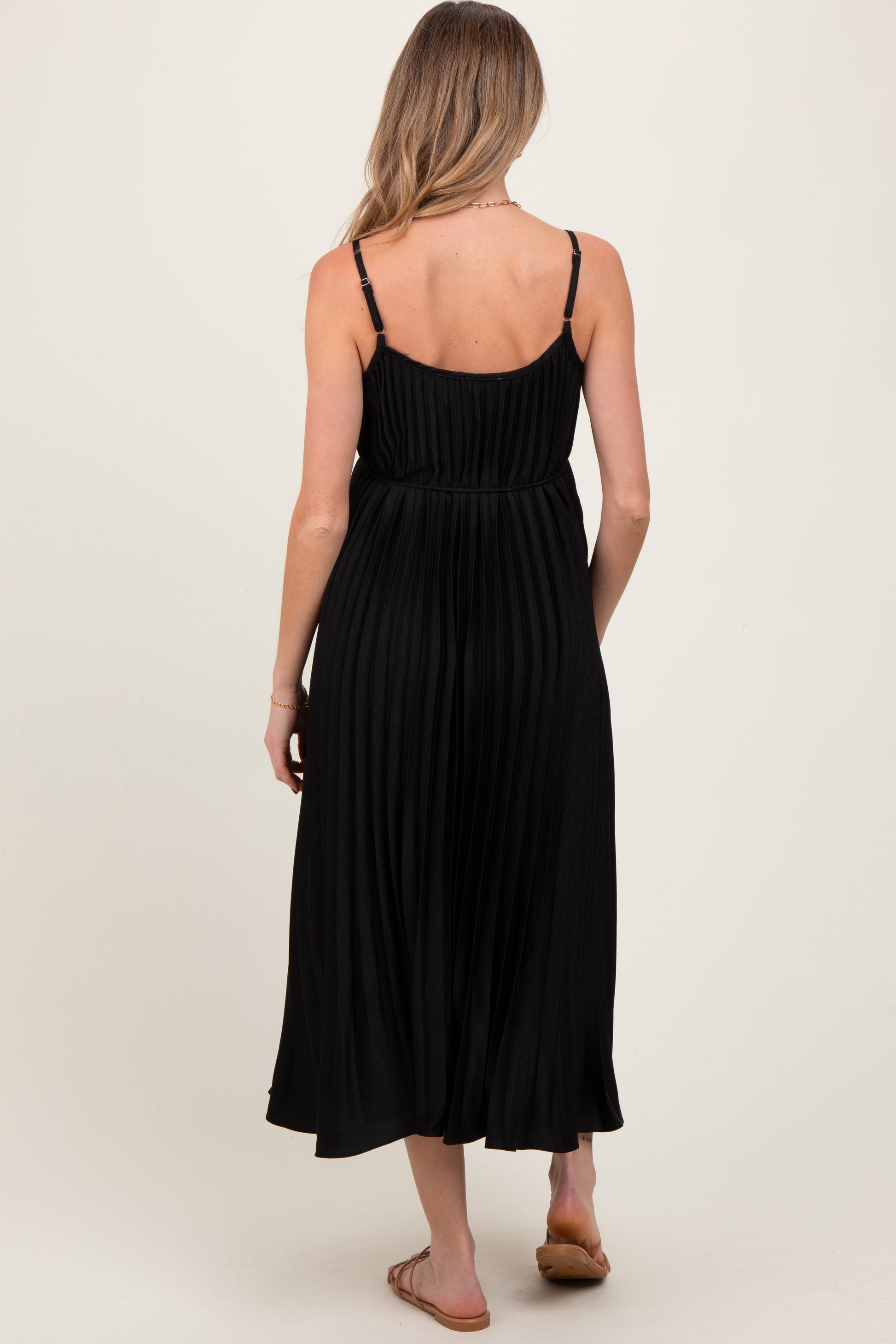 Embrace effortless elegance with our Black Pleated Sash Tie Maternity Midi Dress. Designed with delicate spaghetti straps and a flattering pleated fabric, this dress gracefully flows over your growing bump for comfort and style. The adjustable sash tie at the waist lets you customize the fit, enhancing your silhouette throughout pregnancy. Perfect for casual days or special occasions, its midi length adds a timeless touch. Crafted from lightweight, breathable material, it keeps you cool and comfortable all day long. Elevate your maternity wardrobe with this chic and versatile dress!