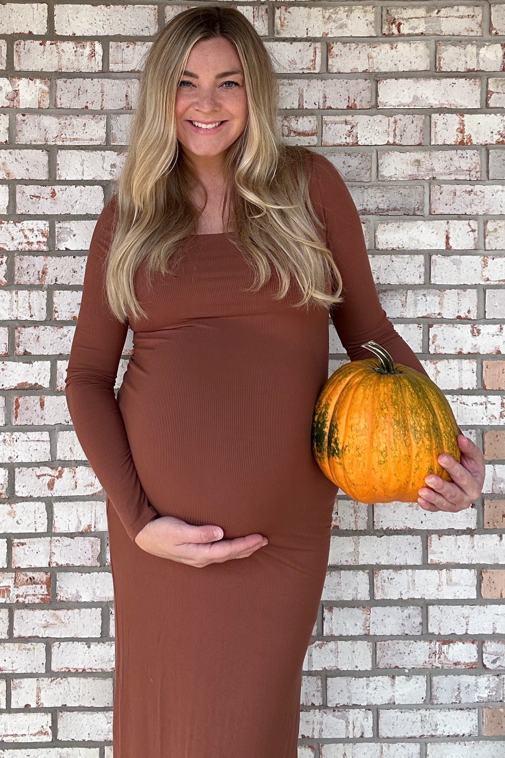 A ribbed maternity midi dress that includes a squared neckline, long sleeve, and a side slit.