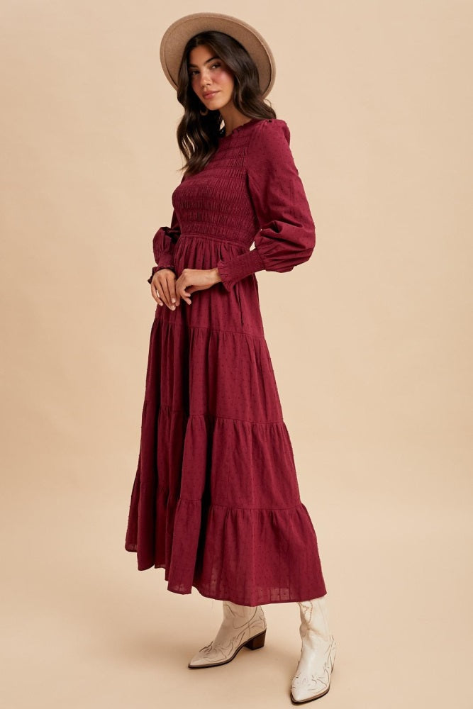 Burgundy Swiss Dot Smocked Tiered Maxi Dress
