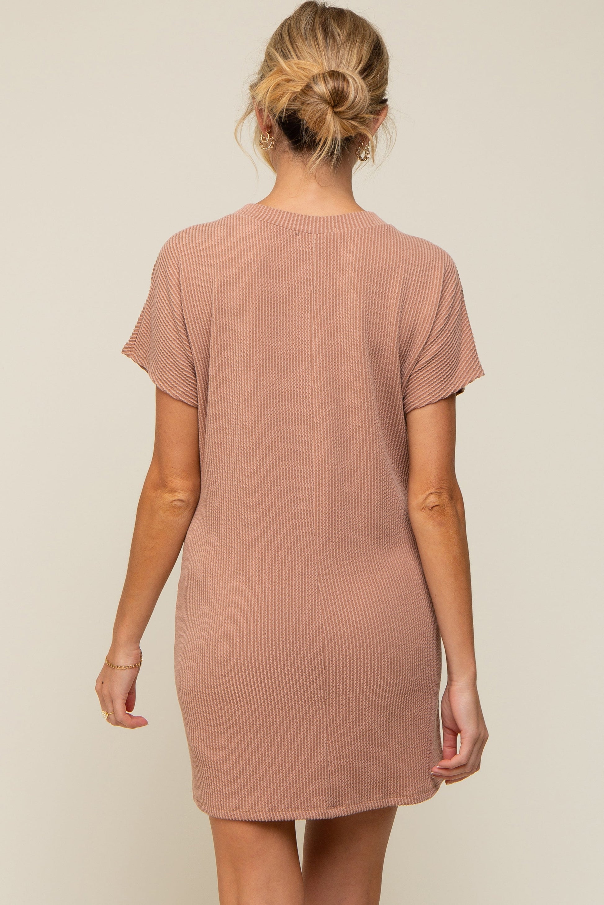 Camel Ribbed Front Pocket Dolman Short Sleeve Maternity Dress