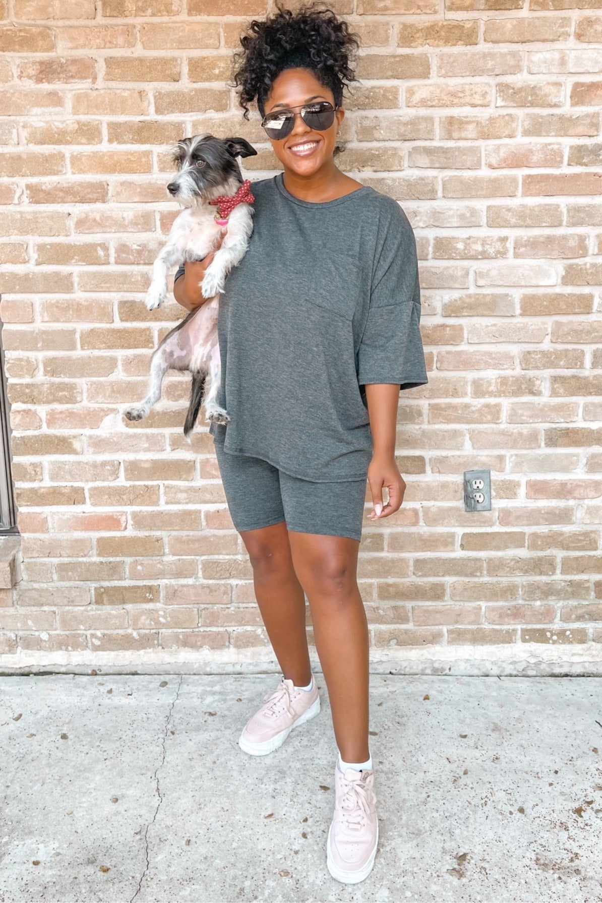 A sleep set featuring a dolman short sleeve top with a front pocket and a pair of biker shorts.
