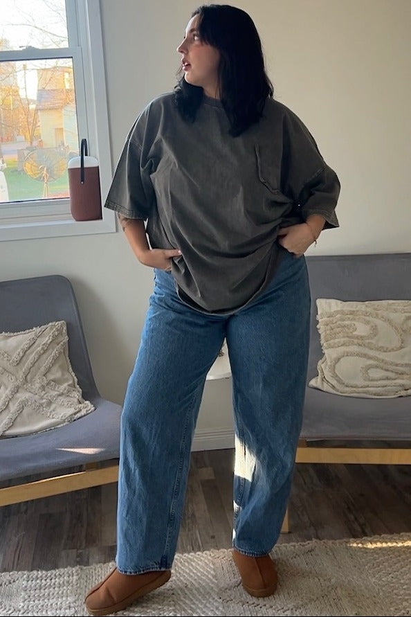 A solid oversized short sleeve top with a crew neckline and faux pocket detail on chest.