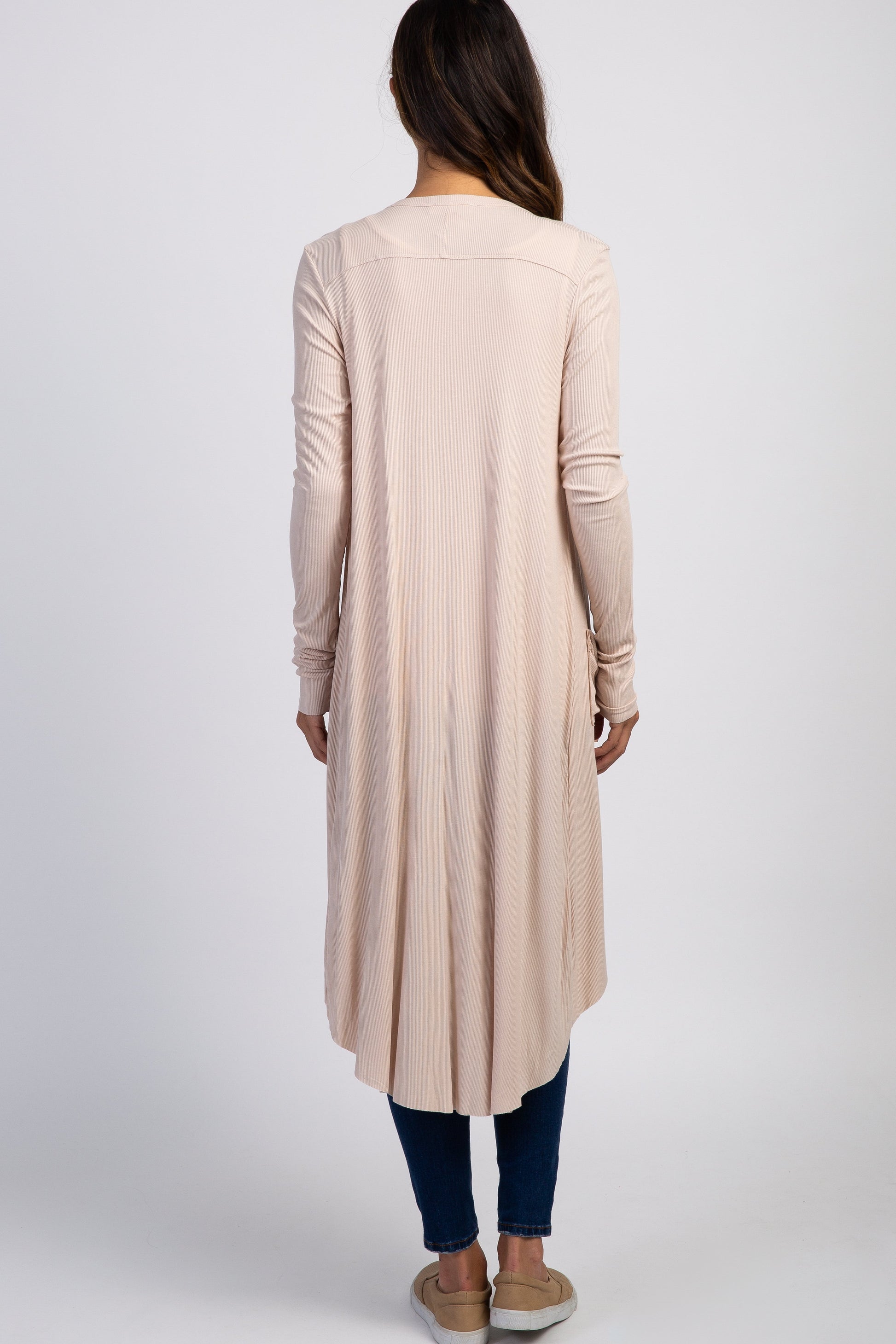 A solid hued maternity cardigan featuring a button front closure, long sleeves, two pockets and hi-low hem.