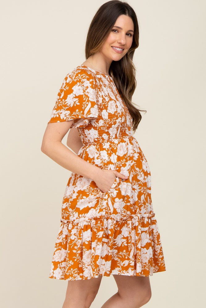 A floral print maternity dress featuring a smocked bodice, short sleeves, side pockets, and a gathered bottom tier.