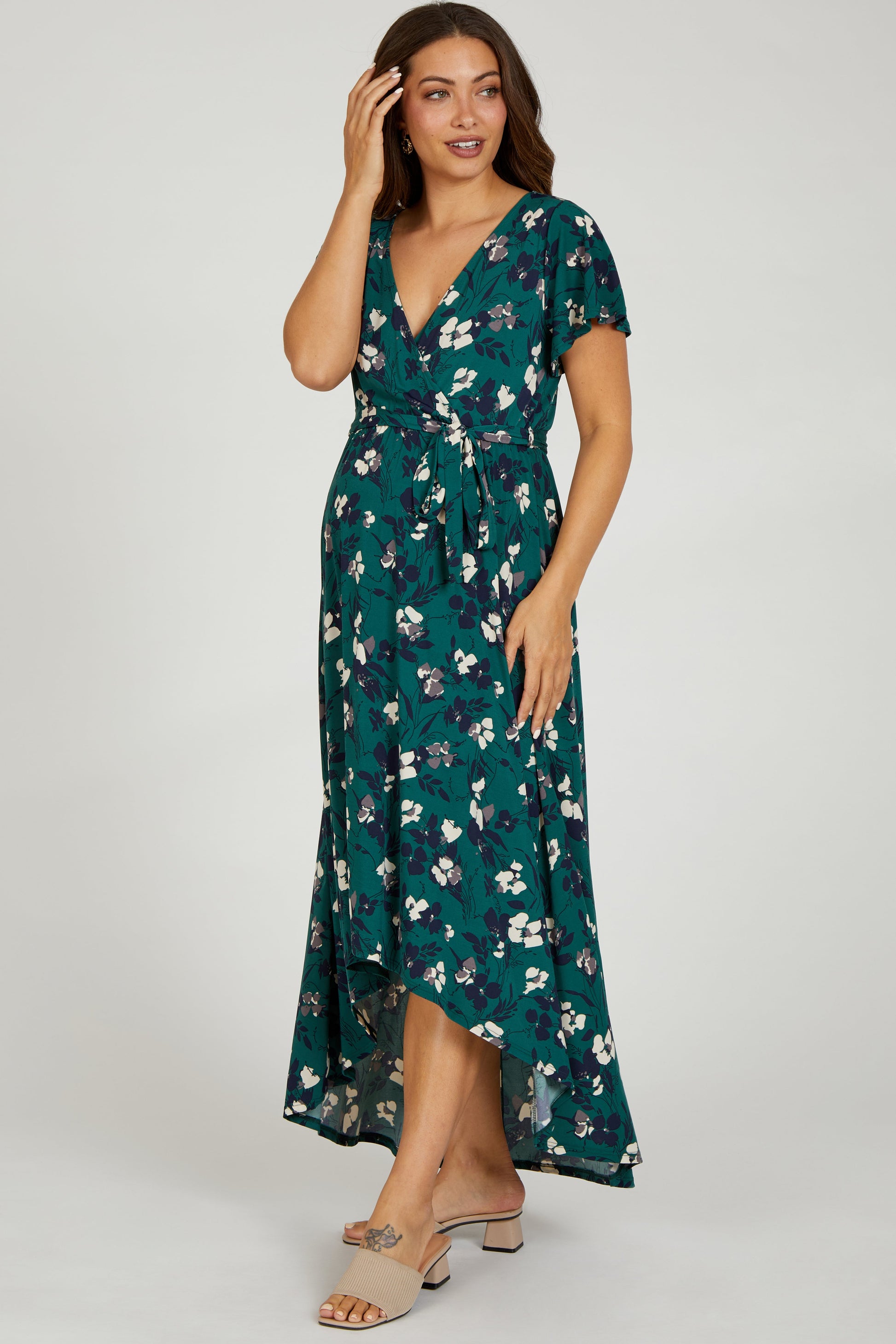 Forest Green Floral Wrap Front V-Neck Hi-Low Maternity Midi Dress