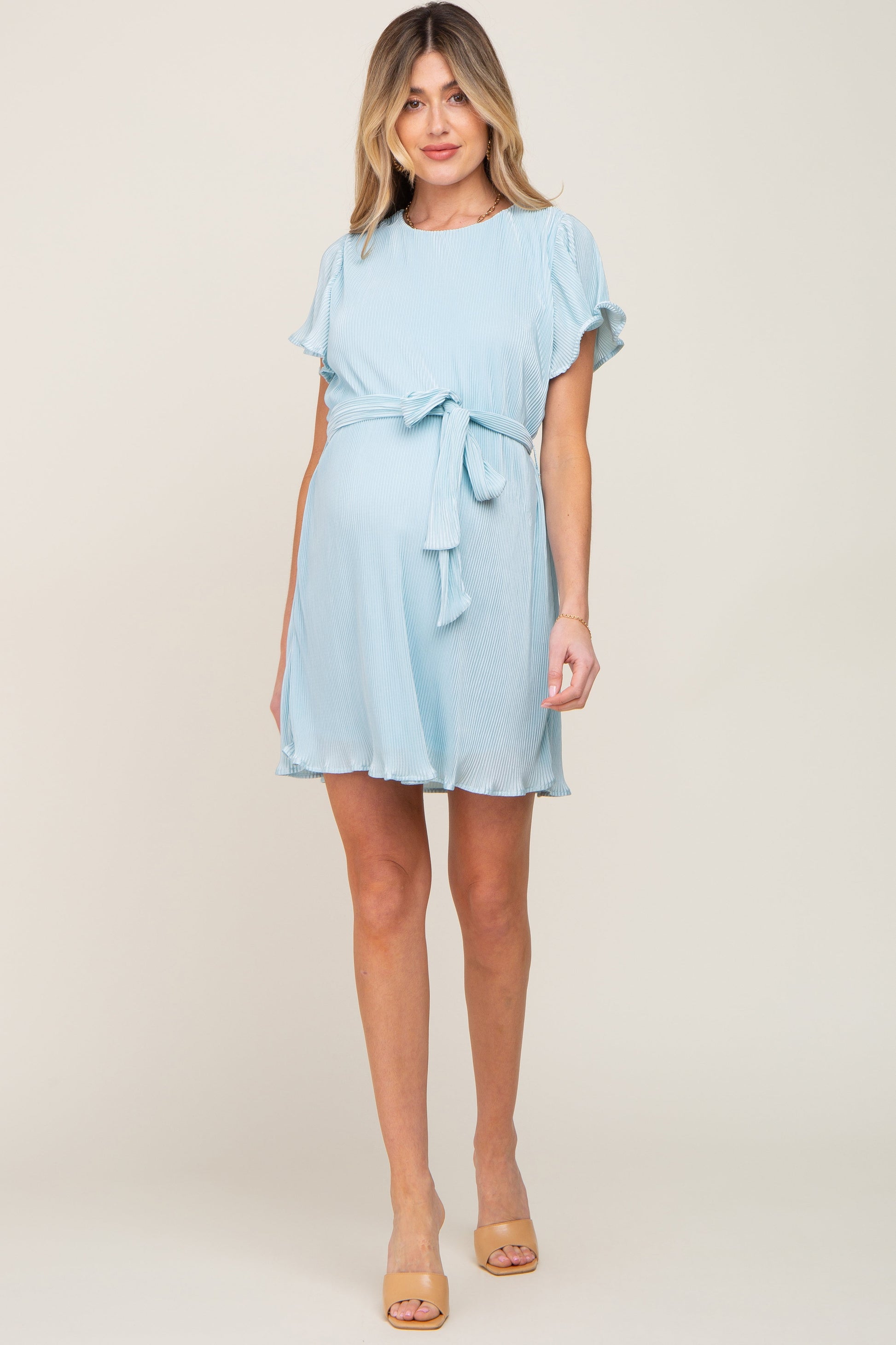A pleated maternity dress with a rounded neckline, short flounce sleeves, a waist tie, and a back keyhole button closure.