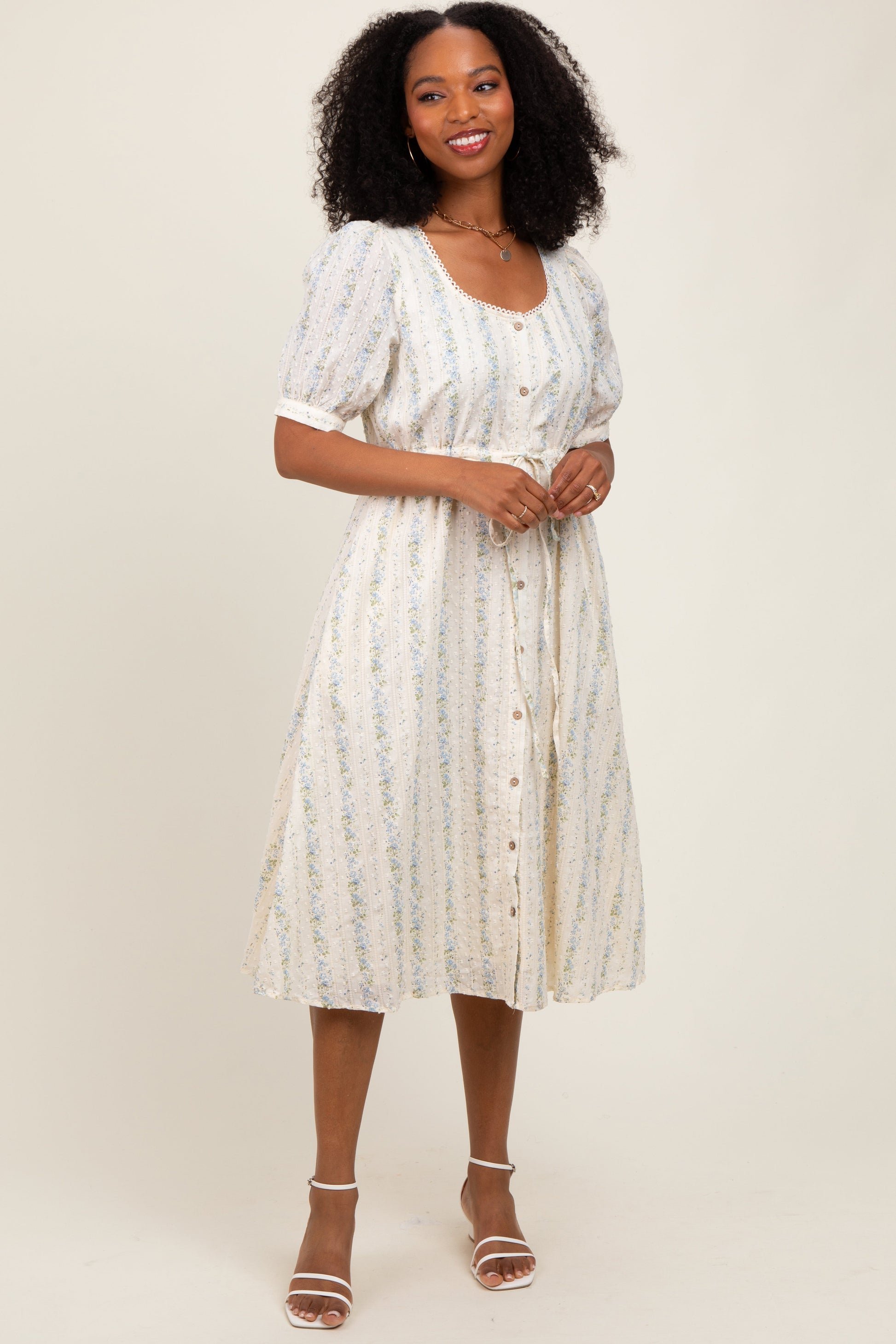 Step into effortless charm with our Light Blue Swiss Dot Floral Print Button-Down Midi Dress. This feminine dress features delicate floral stripes on a soft light blue backdrop, creating a breezy, fresh look perfect for warm days. The midi length and button-down front offer versatility and easy wear, while the puff sleeves and subtle square neckline add a touch of vintage-inspired elegance. Adjustable tie at the waist ensures a flattering fit, and convenient side pockets bring casual practicality. Pair with sandals or flats for a perfect day-to-night outfit. Ideal for casual brunches, garden parties, or weekend outings!