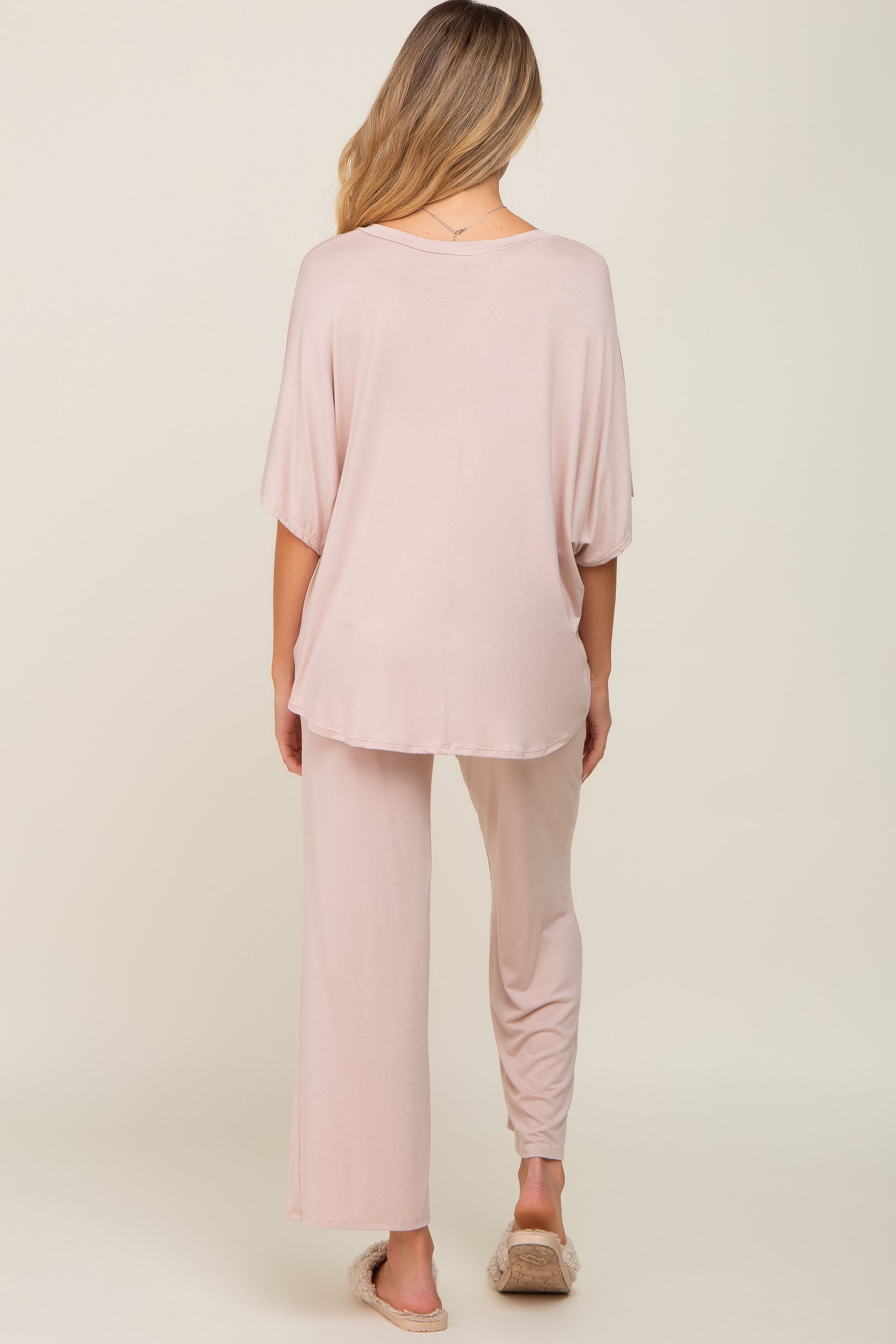 A basic set with cropped pants featuring an elastic smocked waistband. A short sleeve tee with a v-neckline.