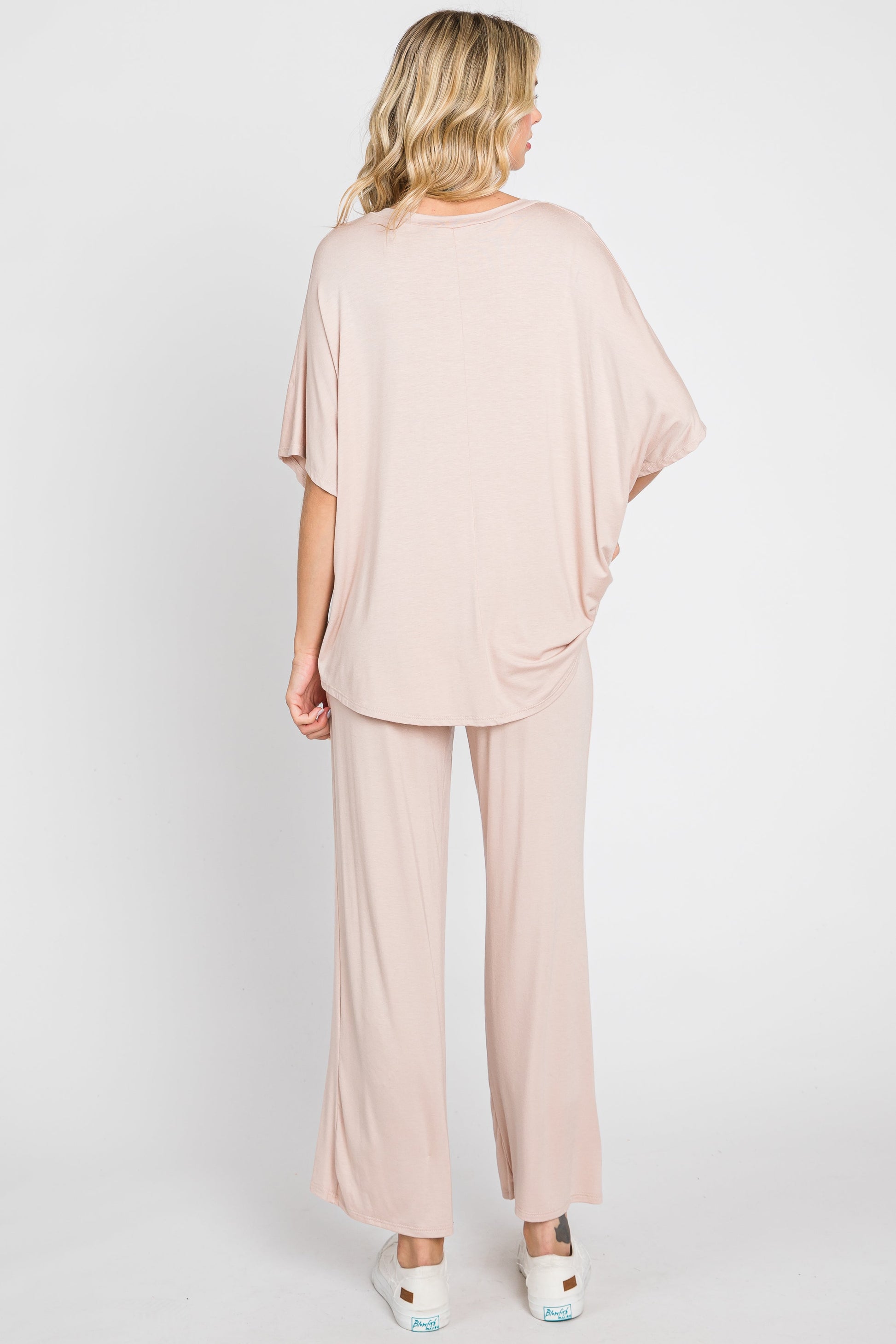 A basic set with cropped pants featuring an elastic smocked waistband. A short sleeve tee with a v-neckline.