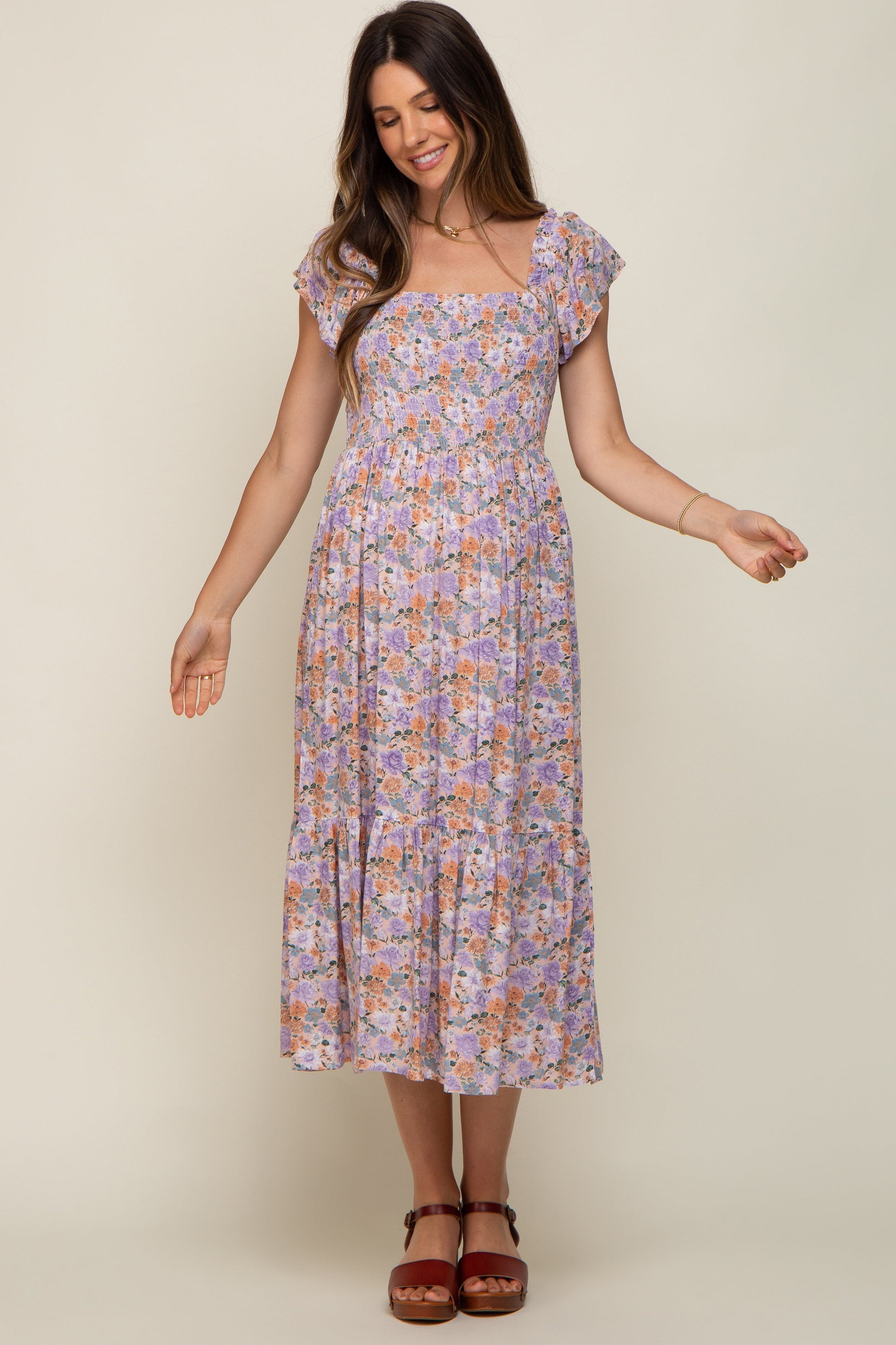 A floral print maternity midi dress featuring an off-shoulder neckline, short flutter sleeves, a smocked elastic top, side pockets and a ruffle hem.