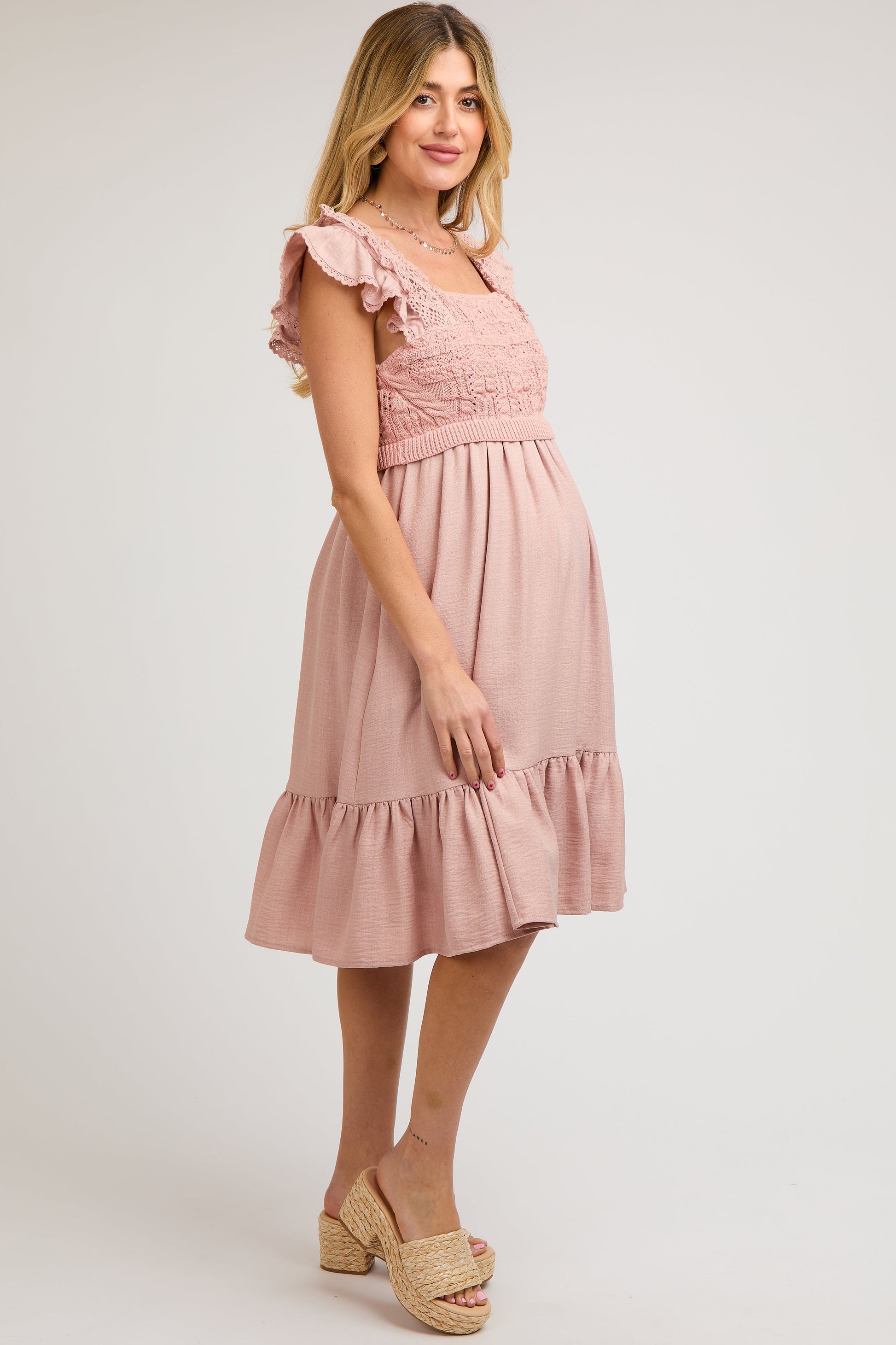 A knee-length maternity dress with a squared neckline, ruffle accent straps, side pockets, and a gathered bottom tier. Features a crochet knit top and is fully lined.