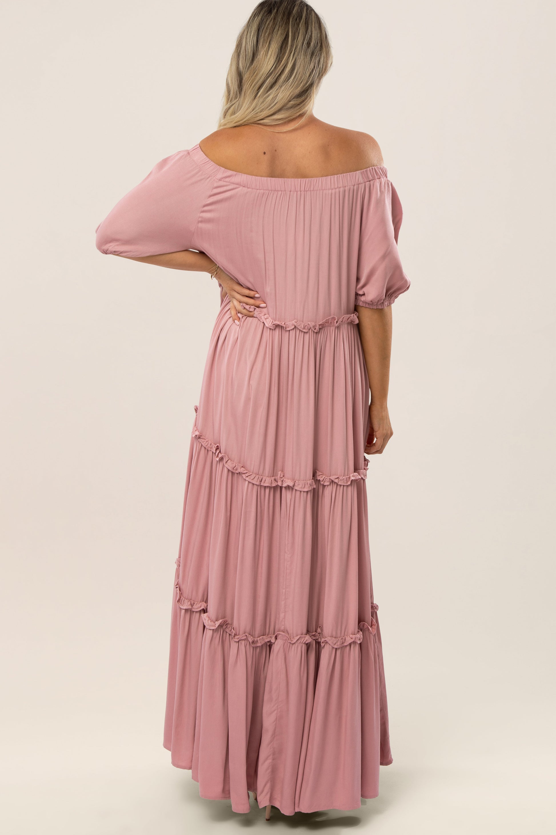 Mauve Off Shoulder Ruffle Tiered Maternity Maxi Dress