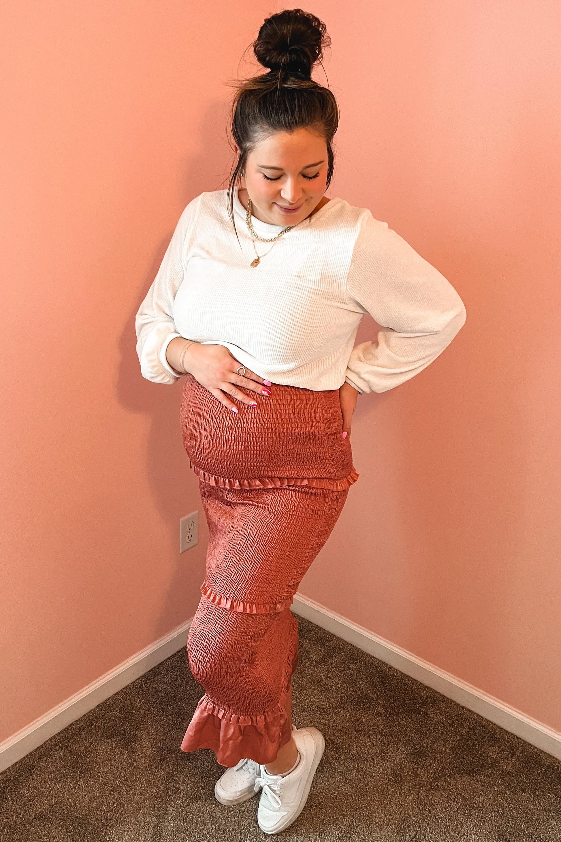 Turn heads at every event in our Mauve Satin Smocked Fitted Maternity Midi Dress. Crafted from silky, lightweight satin in a dreamy mauve hue, this dress features a flattering smocked bodice that stretches comfortably with your changing shape. The midi length and fitted silhouette accentuate your curves while providing freedom to move. Elegant ruffle details and subtle puff sleeves add a feminine touch, making it perfect for baby showers, date nights, or special occasions. Designed to celebrate your bump in style, this dress ensures you look and feel beautiful at every stage of pregnancy.