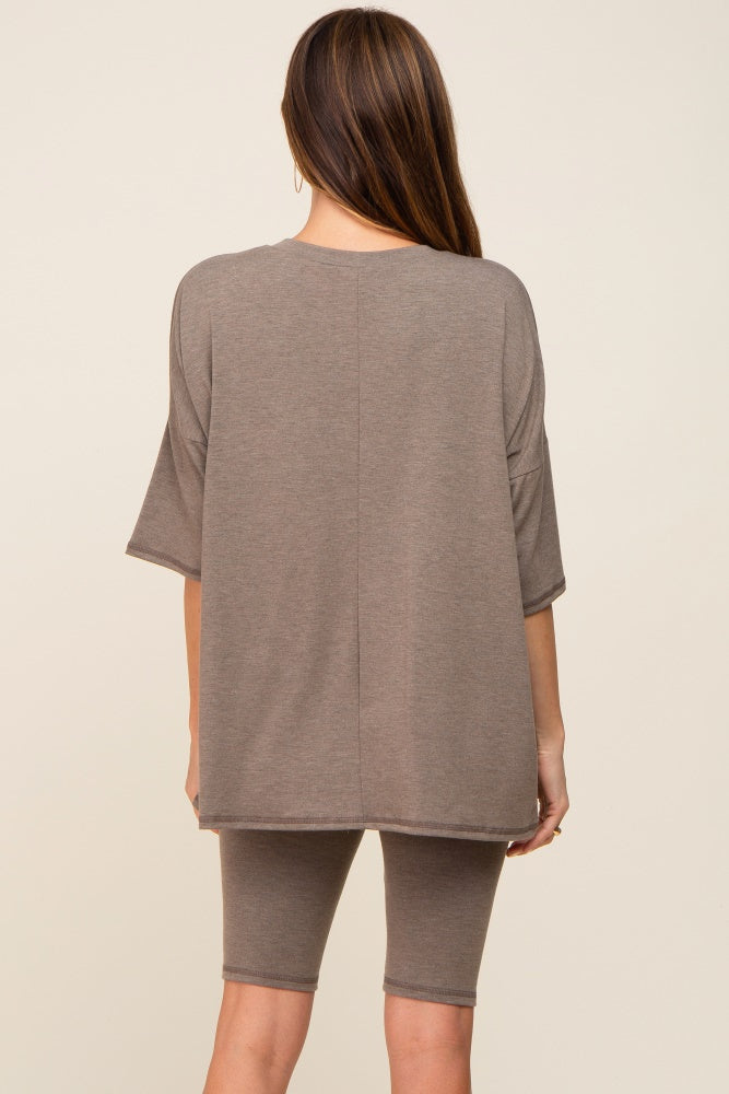 A sleep set featuring a dolman short sleeve top with a front pocket and a pair of biker shorts.