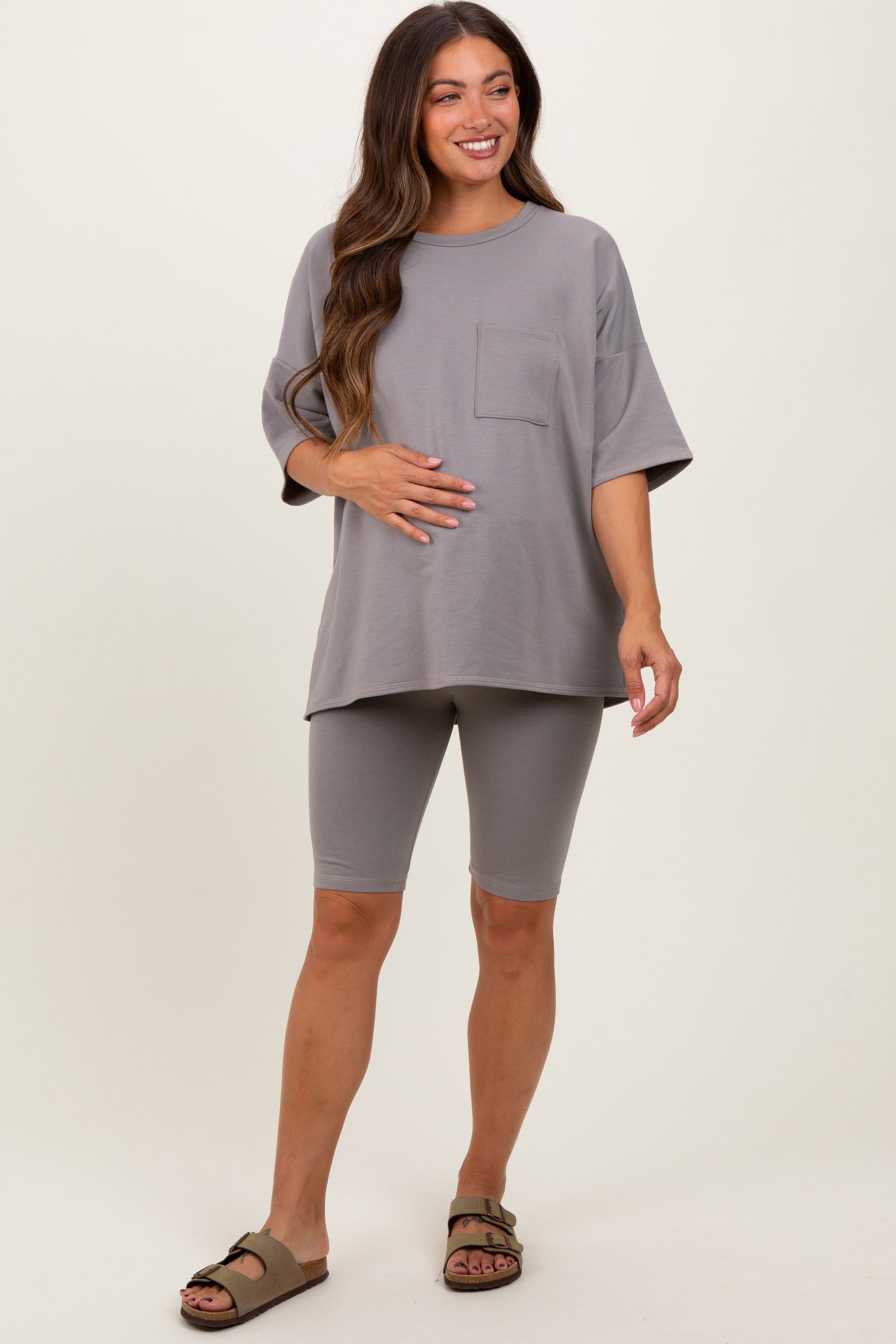 Mocha Oversized Short Sleeve Biker Short Maternity Set