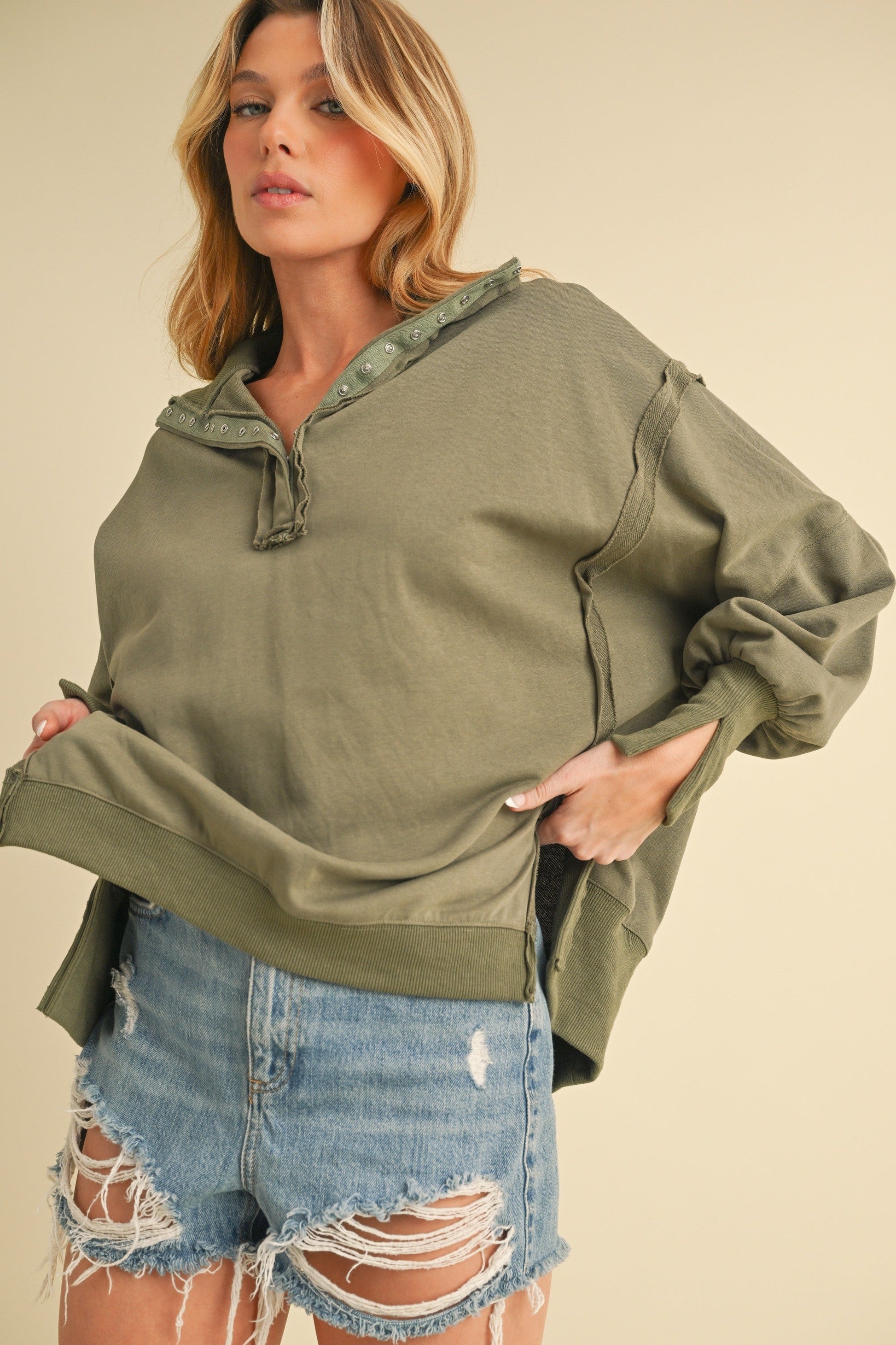 Stay cozy and stylish in our Olive Snap Button Pullover Henley Sweatshirt. Made from super soft, breathable fabric, this relaxed-fit sweatshirt features snap buttons along the neckline for adjustable comfort and a modern twist on a classic henley. The oversized fit and dropped shoulders create an effortlessly cool vibe, while the ribbed cuffs and hem add a touch of structure. Perfect for layering or wearing on its own, this versatile pullover pairs perfectly with denim shorts or your favorite jeans. Embrace laid-back chic with this must-have olive green sweatshirt that transitions seamlessly from casual days to cozy nights.