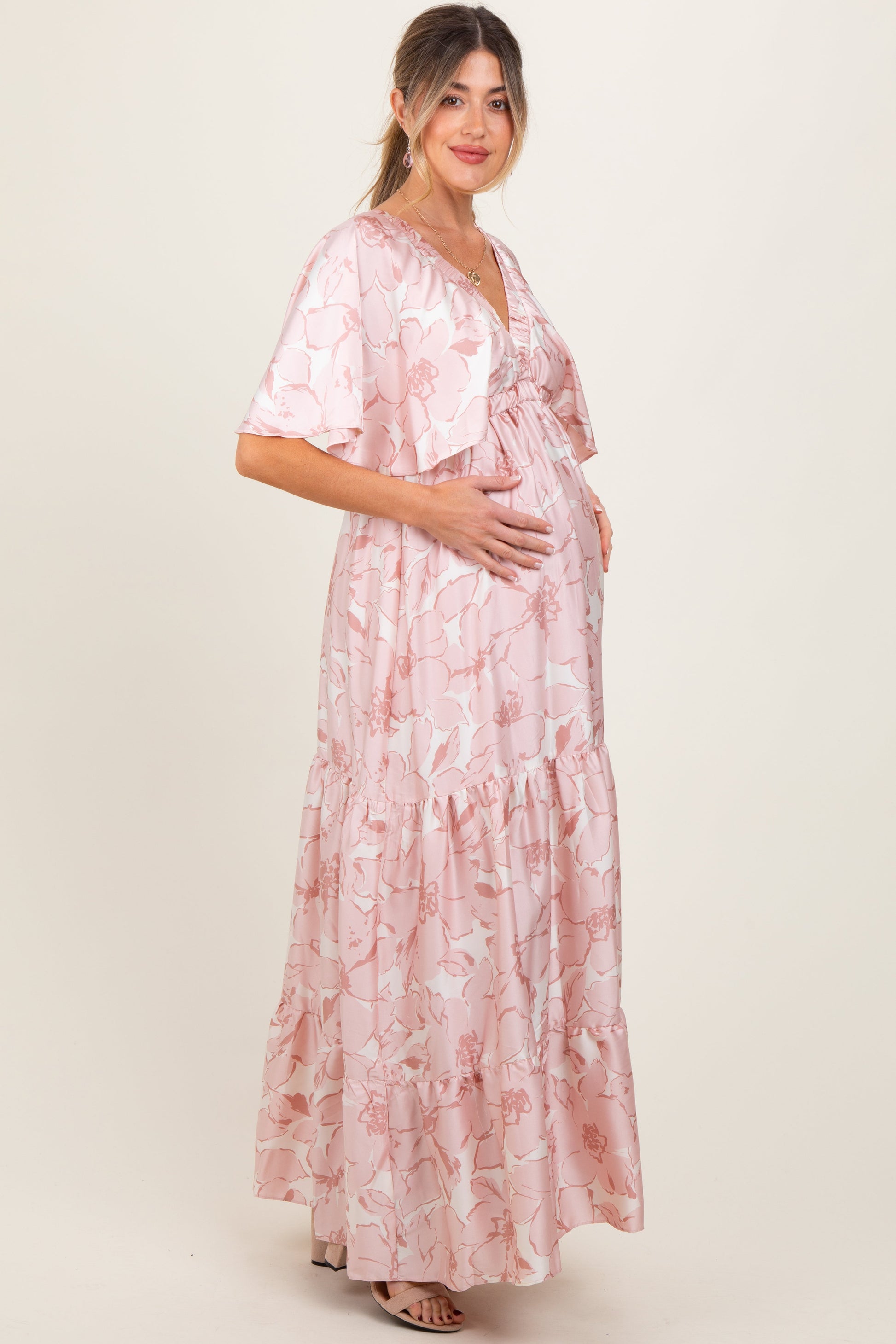 Pink Floral Short Sleeve Deep V-Neck Tiered Maternity Maxi Dress