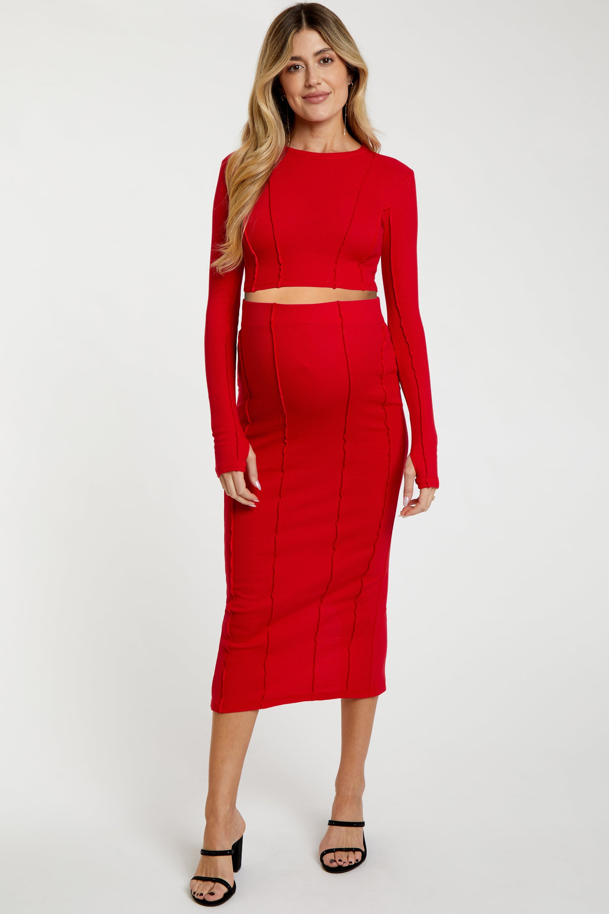 A maternity skirt including a crop top and midi skirt. Top features a rounded neckline, long sleeves, and exposed seams. Skirt features an elastic waistband and exposed seams.