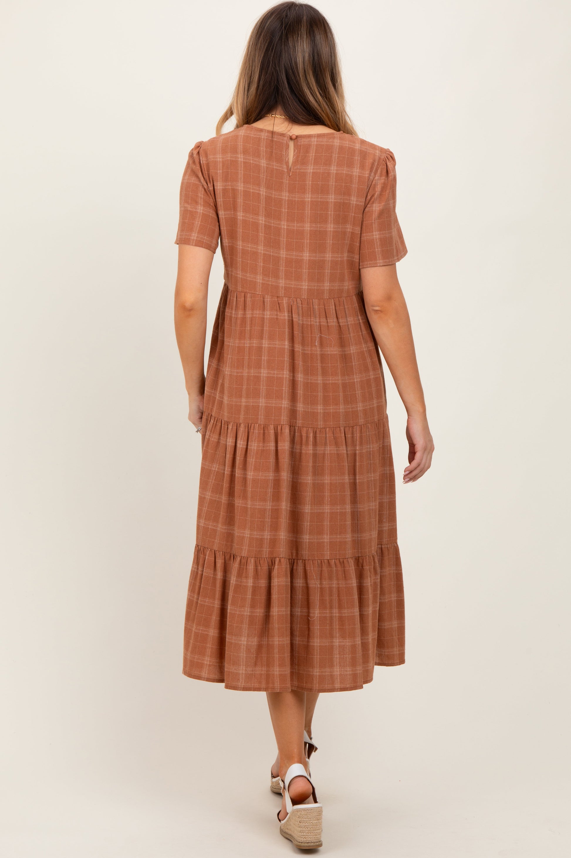 Step into effortless style with our Rust Plaid Tiered Short Sleeve Dress. This midi-length dress features a warm rust plaid pattern, perfect for seasonal transitions. Designed with a relaxed fit, it boasts tiered layers that add flowy movement and feminine charm. Short sleeves provide comfort and versatility for day-to-night wear. Crafted from soft, breathable fabric, this dress is ideal for casual outings or dressier occasions when paired with your favorite accessories. Plus, convenient side pockets add a practical touch. Elevate your wardrobe with this timeless, easy-to-wear piece.