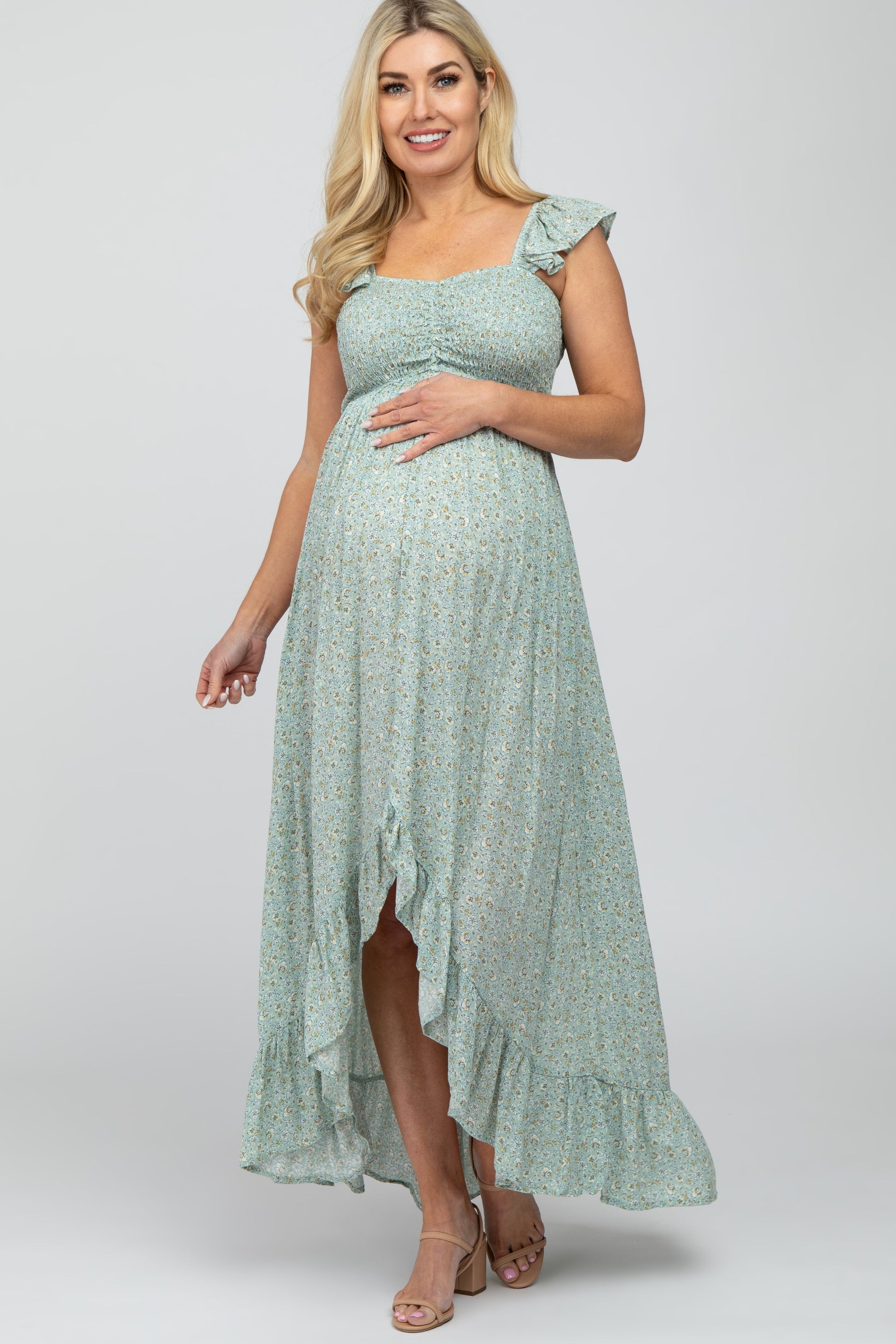 Sage Floral Smocked Hi-Low Maternity Maxi Dress