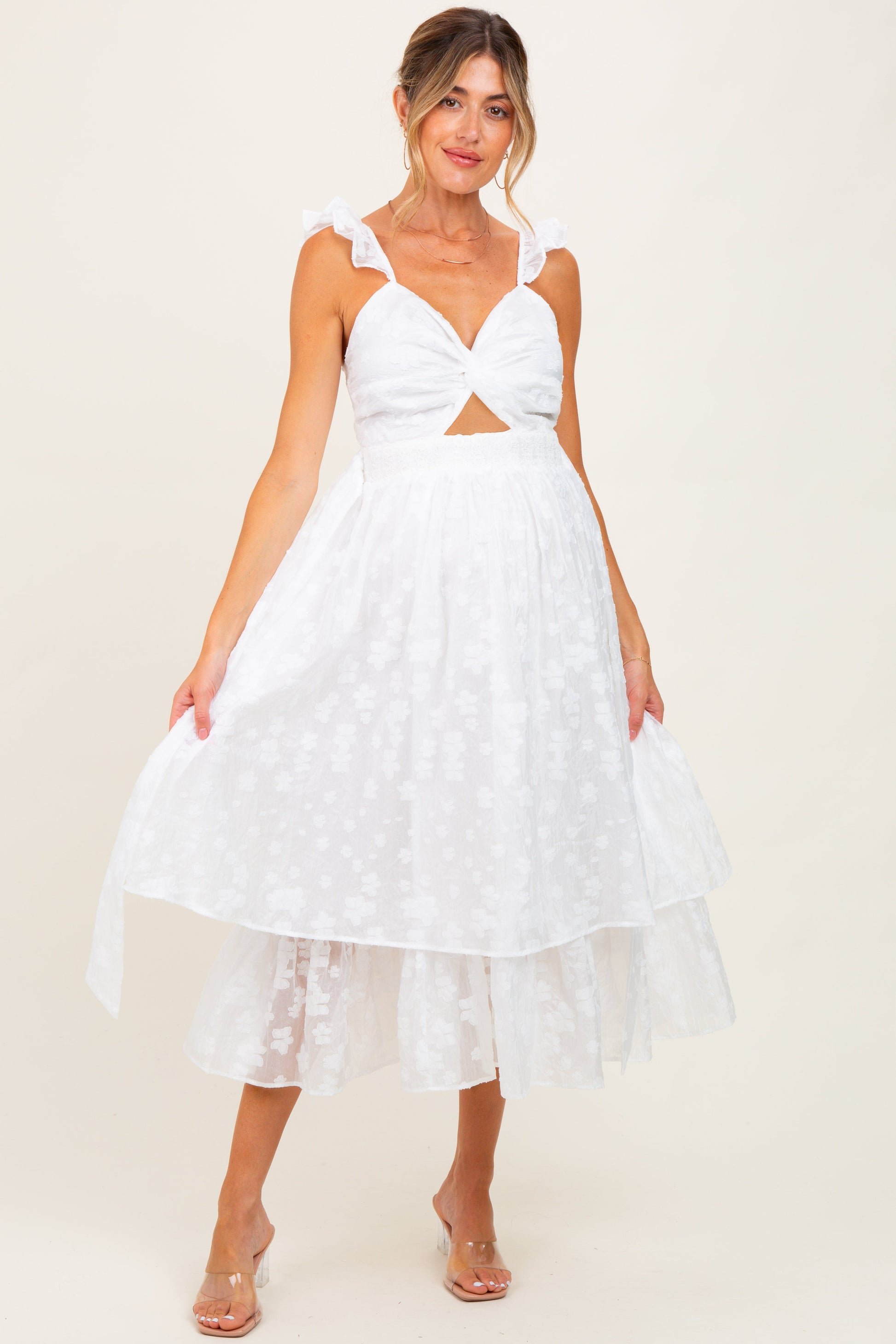 White Embroidered Twist Front Cutout Maternity Midi Dress
