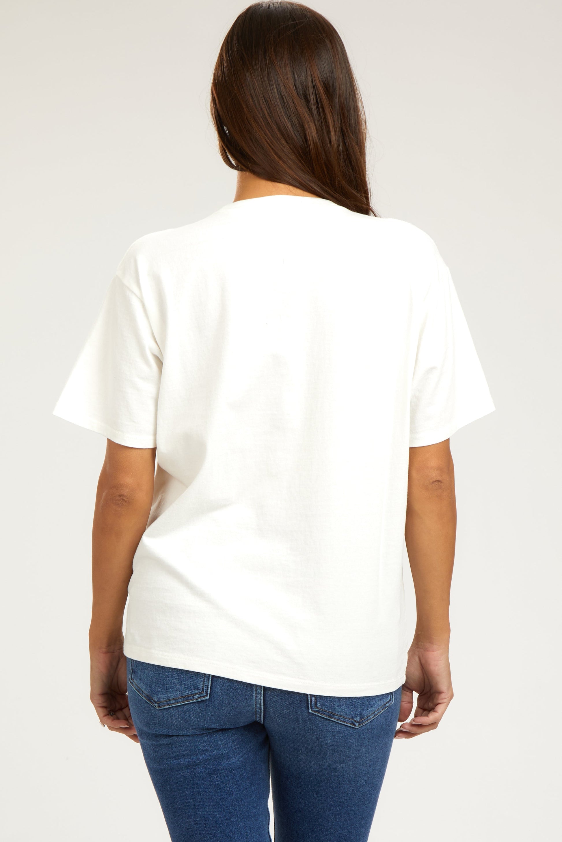 A solid hued maternity top featuring short sleeves and a rounded neckline.